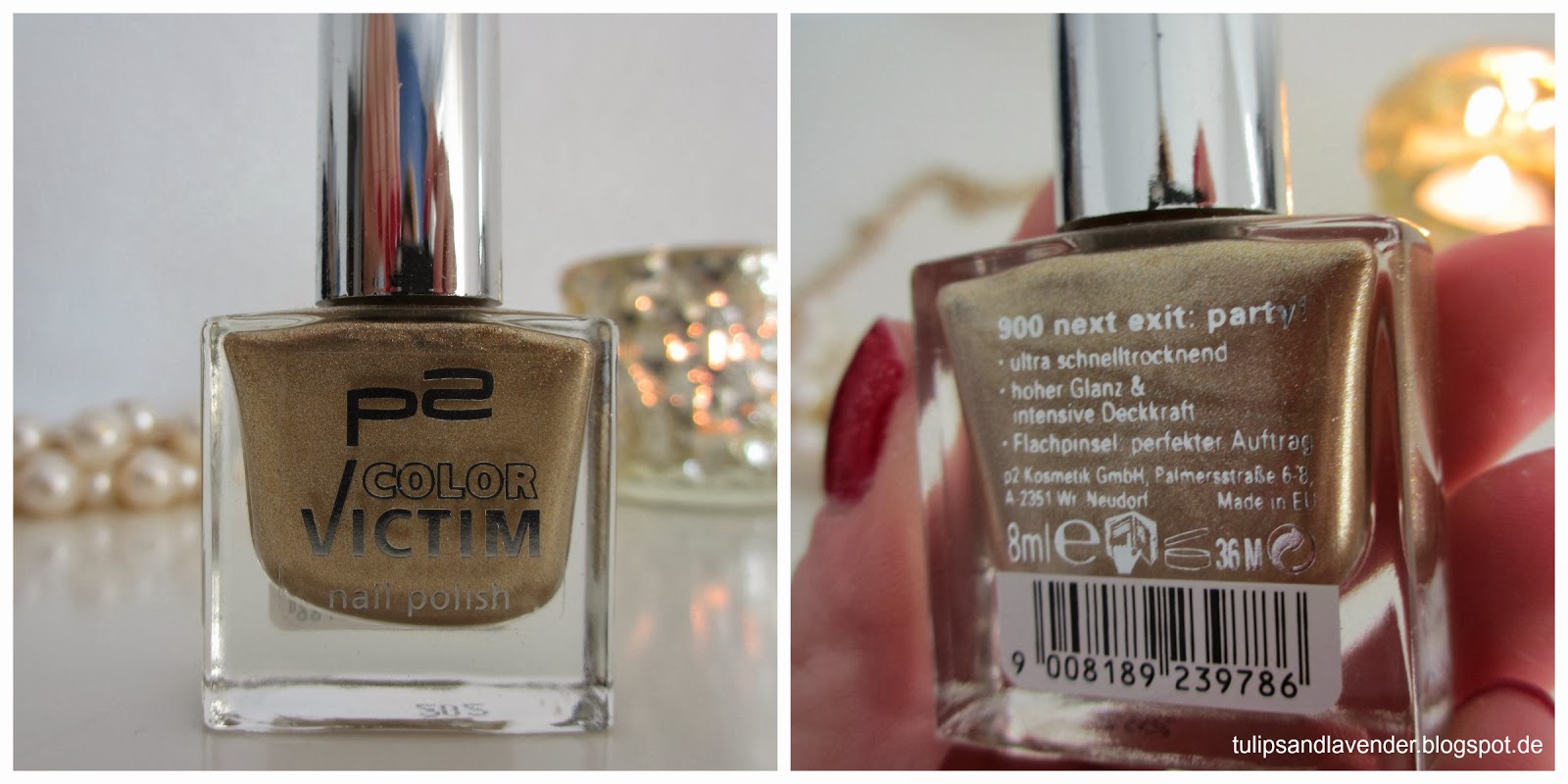 I like applying it on top of a plain red nailpolish to make it more opaque (another tip from Alice). As with most glitter polishes it takes some time,patience and quite a few cotton wool pads and nailpolish remover to get it off again but for me it’s so worth it. With a price of under 3 Euros it’s a bargain aswell.